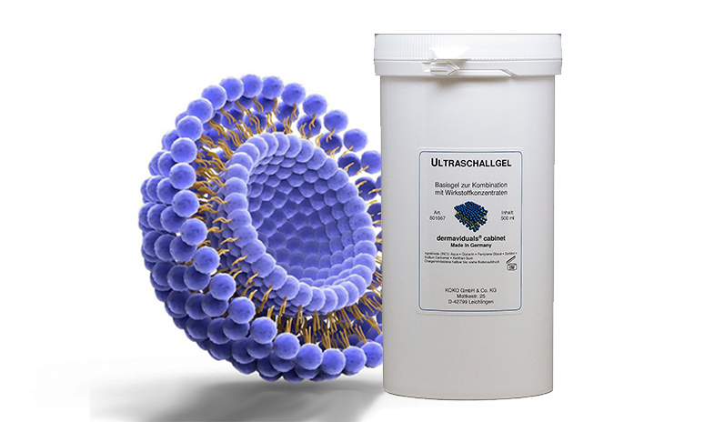 Application: The gel is spread on the skin before the ultrasonic treatment. Aqueous active agent concentrates may either be applied before the ultrasound gel or blended with the gel. Also oily active agent concentrates like grape seed or rose hip oil (essential fatty acids) may be used if they are first mixed with liposomes and nanoparticles and then blended with ultrasound gel.
